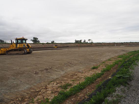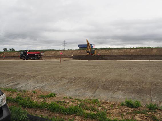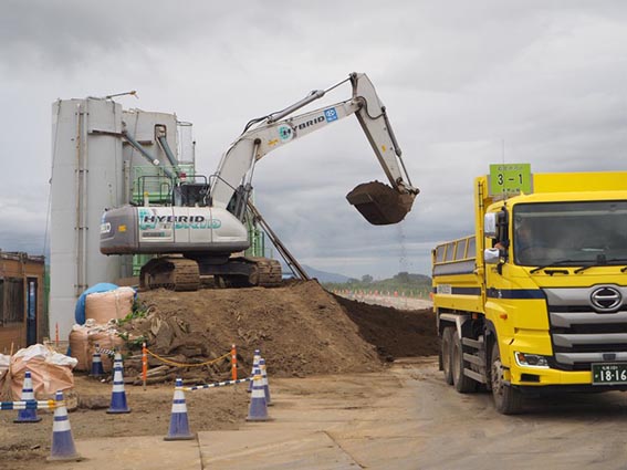 次に訪れたのは「旧美唄川囲ぎょう堤」の現場です。こちらの現場は北村遊水地事業における囲ぎょう堤として既存の堤体断面を大きくするために、築堤盛土を行っている工事です。盛土層数の21層のうち、この日は9層目の作業をしていました。希少生物であるオジロワシ生育環境保護の影響で工事の着手が遅れたことと、工事箇所に隣接する水田への影響に配慮しながらの施工に苦労されているとのことでした。