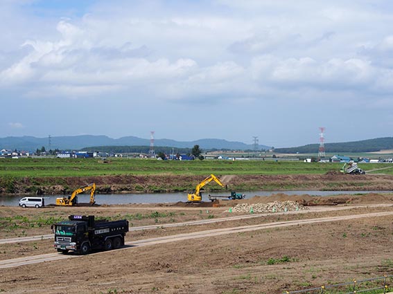 次の現場は、先ほどの頭首工の現場から1kmほど移動したところにある「雨竜川八丁目導水路」です。こちらの現場は、国営総合農地防災事業雨竜川下流地区の事業計画に基づいて、八丁目頭首工導水路の整備を行うものです。新設される頭首工(当社施工)が既存位置より雨竜川の上流側に建設されるため、頭首工より取水された農業用用水を下流側へ流下させる導水路の施工を行っています。河川環境を改善し、正常な機能の維持と増進を図ることで、農業用水を安定的に供給することができます。