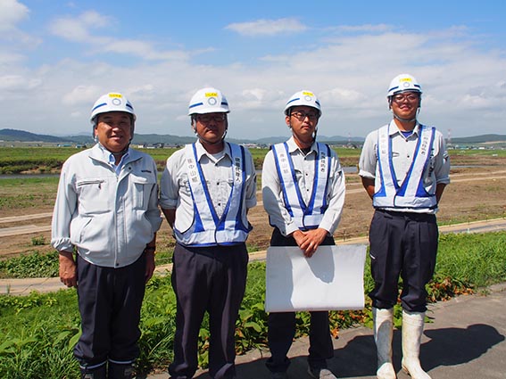 整地工や暗渠排水工など春から夏にかけて予定していた施工を終え、落水後の作業に向けて準備している時期の訪問だったため、残念ながら現場は見ることができませんでしたが、幹線用水落水後及び隣接するほ場の収穫後に測量・現況調査等を随時行っていくことや、用水路総延長が1447.56mとなるため施工完了箇所から工事用道路等仮設を切り替え施工することなど、秋施工となる9月以降の予定についてお話を伺い事務所を後にしました。