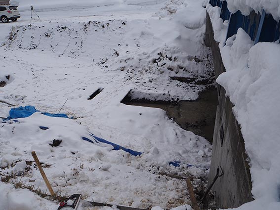 2つ目に向かった現場は「江別南5線集水路外」の現場です。こちらの現場は、道路沿いにある既設柵渠の拡幅工事になります。約350mの長さを施工し、幅3.2m、高さ2.6mの排水路工を行っており、訪問時で300mほどまで完了している状況でした。