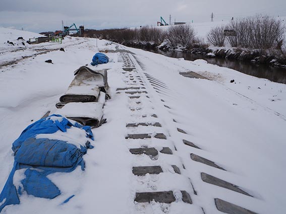 最初に向かった現場は、「利根別川広域河川改修」の現場になります。こちらの現場は、洪水対策として川の拡幅工事を行っています。施工箇所が3工区に分かれている点や、住宅地付近での作業、元々の川幅が狭く重機を入れるのが大変など施工するに当たり苦労する点が多くあるとのことでした。施工地が岩見沢ということもあり、積雪量も多く、さらに、工期終盤の追い込み期での雨で雪が溶けてしまい、川の水位が上がってしまうなど天候面においても大変な現場でした。これから竣工に向けラストスパートに入っていきますが天候面はもちろんのこと、雪が溶けての事故などがないよう工事を終えてほしいと思います。お忙しい中、対応していただきありがとうございました。