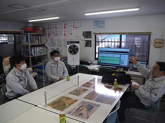 3つ目に向かった現場は、「島松川右岸築堤盛土外」の現場になります。こちらの現場は、昨年行った島松川築堤河岸保護工事と島松川左岸河道整備の間の工区の盛土、撹拌土造成工事を行っています。訪問時には、法面の整形、連接ブロックの敷設作業を行っていました。2月いっぱいでブロックの敷設も終える予定です。また、遠隔臨場システムを導入しており、社内検査や協議会の安全パトロールもこのシステムを活用し工事を進めているとのことでした。竣工に向け残り少ない工期ですが、無事故、無災害で竣工を迎えてほしいと思います。お忙しい中、対応して頂きありがとうございました。