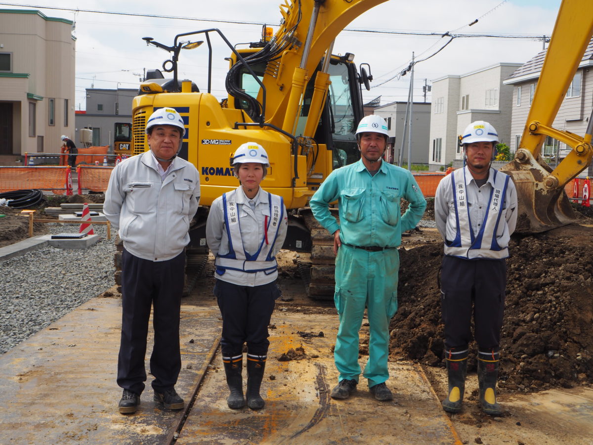 続いてお邪魔したのは「篠路駅西通道路改良」の現場です。こちらの現場では、篠路駅周辺の慢性的な交通混雑を改善するため、篠路駅へと続く道路の新設工事と既設道路の拡幅工事が行われています。通行止めにして日中時間帯の施工が可能なため、施工が夜間に及ぶことはありませんが、住宅街での施工ならではの制約もあり、朝は9時から夕方17時と施工できる時間が決められていることや、騒音などにも配慮しながら施工を進めていきます。