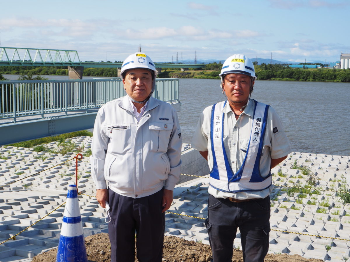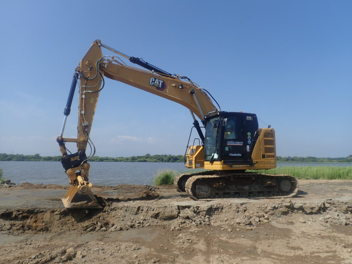 続いて向かったのは、「美登位築堤河道掘削外」の現場です。こちらの現場では、洪水時に川が氾濫しないよう、川沿いの土を掘ることで水が流れる面積を広くする工事を行っています。掘り出された土砂は千歳市・恵庭市の遊水地内で他工事により攪拌後、堤防等の盛土材として使用されるとのことで、6月中旬から8月中旬にかけて大多数のダンプトラックによる長距離運搬を行い、現在は掘削・土砂運搬工事がほぼ完了していました。