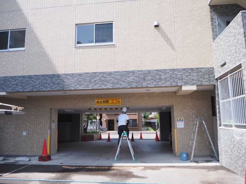 2つ目に向かった現場は、「エナコート南円山修繕」の現場になります。こちらの現場は、外壁・バルコニ床防水・外部階段床防水などの外装の修繕を行っています。視察当日は、1階周囲のタイル洗い、各所塗装ダメ廻りが行われていました。現場では、クレーンを使用できず、手間や工期がかかることや、駐車車両の移動先が必要数確保できないため、頻繁な場内移動が必要となり、車両を養生しながらの作業となり、苦労されているとのことでした。