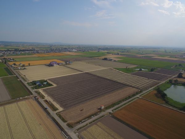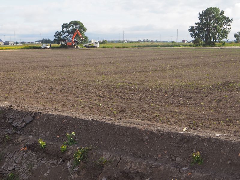 初めに訪問した現場は「美唄166・167工区ほ場」です。こちらの現場では、訪問時には整地工が終わり、暗渠排水路工がメインで行われていました。天候に恵まれたおかげか、工事は順調に進んでいるそうです。面工事はほとんど終了し、8月末の引き渡しに向けて作業をされていました。ほかには農道工、落水後に行う予定の用水路の施工、道路横断工、その他の細かな作業が残っているということです。
