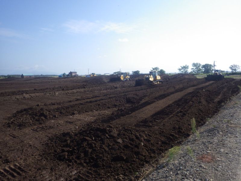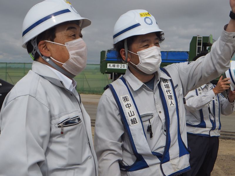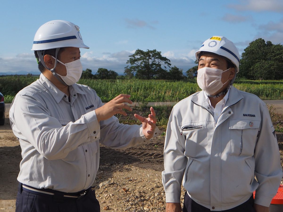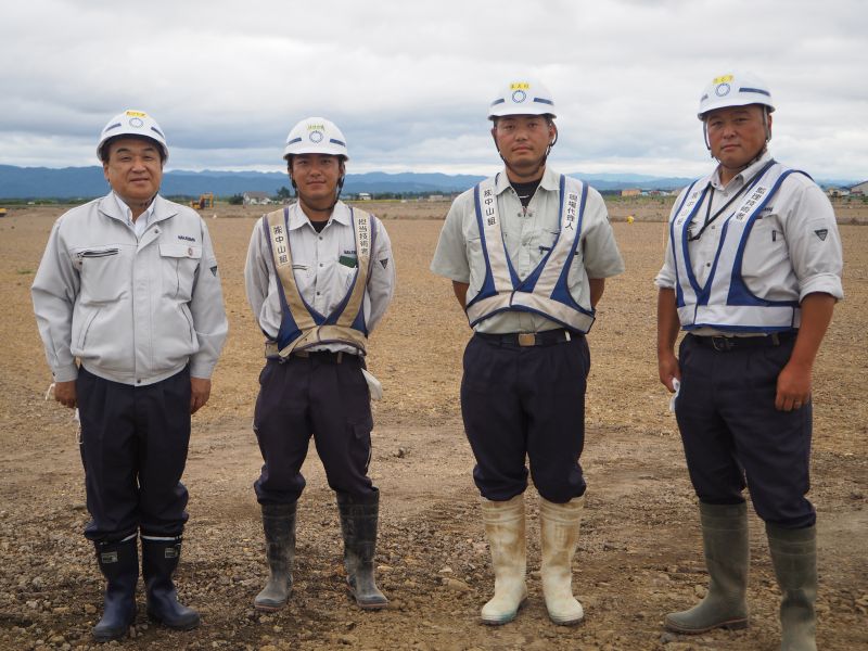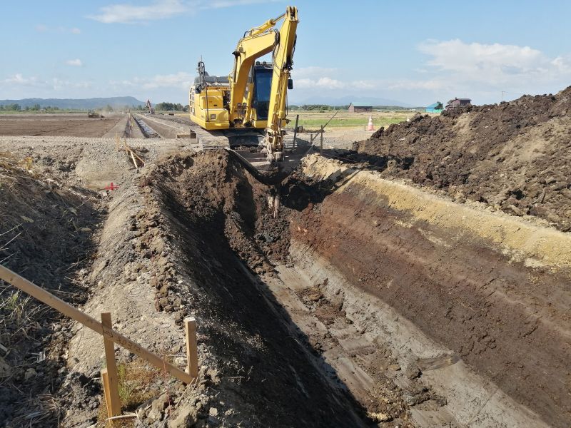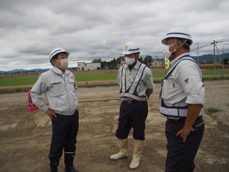 こちらの現場は泥炭地で地盤が緩く、工事の機械が入ると揺れを感じるため、近隣の人家に気を遣いながら作業を進められていたそうです。また風の強い地区でもあり、すぐ近くにある農家さんの土地に砂埃が止まないようにネットを張ったり、水を撒いたりして対策をしたとも話していただきました。