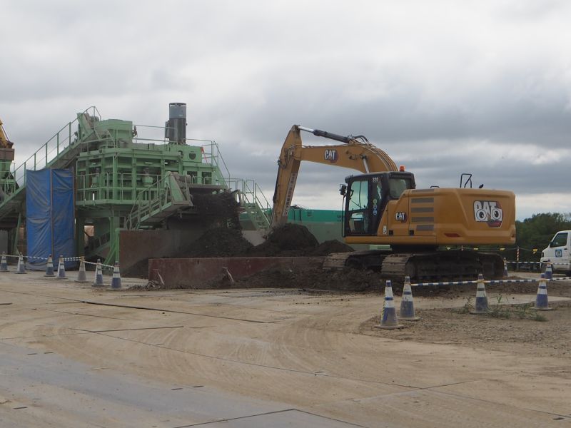 次に向かったのは「北村中央攪拌土造成」の現場です。こちらの現場では、土砂を加工する攪拌施工ヤードを近くで見させていただきました。また、「北村雁里攪拌土造成」の現場と近くに位置しているため、筒井さんも交えての視察となりました。「北村雁里攪拌土造成」と同じように攪拌土を作っていますが、改良材にセメントが使われているとのことです。セメントを混ぜることでそのままでは堤防に盛土できない土を盛土に最適な良質土へと改良しているそうです。訪問時、現場にはダンプカーがひっきりなしに出入りしており、作業の忙しさが窺えました。