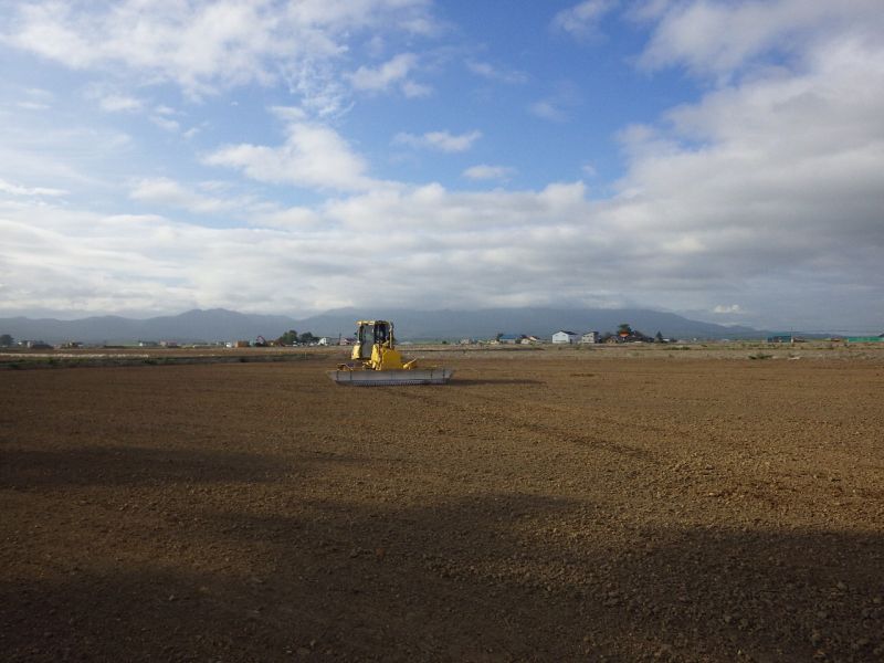 次に、「美唄123工区ほ場」の現場を訪問しました。訪問時には、ちょうど前日に暗渠工が終了しており埋め戻しの仕上げ作業をしているとのことでした。また、用水路や排水路の施工も9割方終わり、計画よりも施工が進んでいると説明してくれました。全体の進捗率は84%ほどだということです。