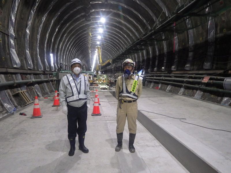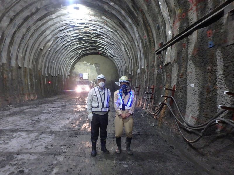現場で西松建設の吉平所長及び職員の方々との挨拶後、渡邊さんの案内でトンネル現場内に入りました。現場は現在掘削作業は中断していて作業はインバートコンクリート打設中でした。トンネル内は隣接する工区の村山トンネルと貫通していて現場内の照明も明るくなり、2年前の訪問時と比較すると工事も進捗し大分変わっていました。社長は2年前来た時にトンネル内の上部に設置したベルトコンベアーで掘削土を搬出していたことを記憶されいて渡邊さんに確認していました。現場内は綺麗に整理整頓されており、現場職員の人方々からは快く挨拶していただき気持ち良く現場を視察させていただく事が出来ました、有難うございました。