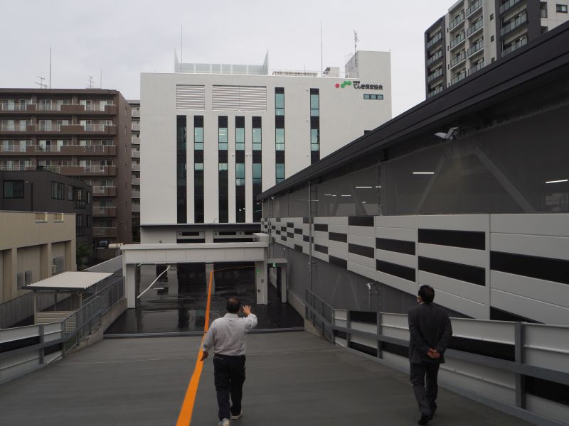 こちらの現場は、南14条西9丁目の地上5階建てのオフィスビルの新築工事です。まもなく竣工とのことで、社内検査の為、現場代理人の髙橋所長に出来上がった建物を最上階から順に見せていただきました。5階には会議室や休養室、4、3、2階には事務室や書庫、リフレッシュルーム、1階には試験室・備品庫などが配置され、社屋の西側には85台の車両を収容できる自走式の駐車場がありました。