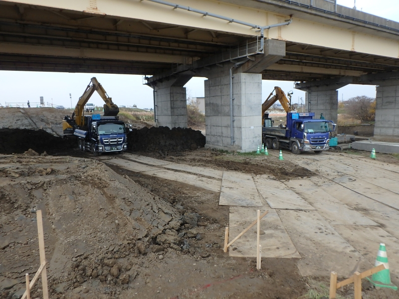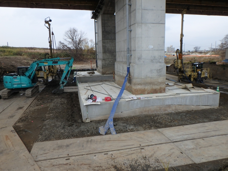 初めに向かった現場は、江別市にある「千歳川大橋地盤改良工事」です。こちらの現場では、千歳川にかかる道央道の橋脚の補強です。工事は橋脚のフーチングを約1.0mのかさ上げ、まわりに直径1.7m、長さ14mの杭を高圧噴射攪拌(セメントミルクを注入)で造成する地盤改良が行われていました。訪問時には、三つある橋脚のうちの一つの補強作業や堤防の開削作業などが行われていました。今後堤防の断面を大きくする予定があり築堤盛土により橋脚に変形が起こってしまう可能性があるため、コンクリートで橋脚の高さを上げ、周りの地盤の改良を行っているとのことです。全体的には想定通りに工事が進んでいるそうです。