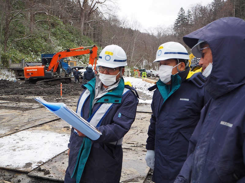 取材時には道幅の狭い道路を多くのトラックが行き交っており、大変労力と時間のかかる作業だなと思いました。また、土砂を運ぶ道のりも峠を越えるため、雪の量が増える今後の作業には十分気をつけて、進めてほしいと思いました。冬期施工となりますが、今後とも無事故・無災害で竣工を迎えてほしいと思います。また、寒さも厳しくなるので健康にも留意して下さい。お忙しい中、丁寧に説明をして頂いた現場の方々本当にありがとうございました。