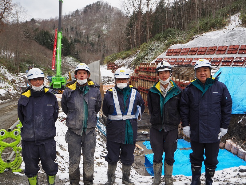 現場は、昨年施工したR1美唄富良野線擁壁工の工事の延長箇所を施工しており、川西所長の現場ではアンカー工等による擁壁工を行い、伊藤所長の現場では道路の路体盛土を主に行っています。