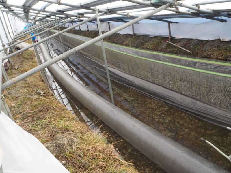 最初に訪れた現場は幌向川幹線用水路になります。こちらの現場は、約3キロの用水路の補修工事をしています。既設の用水路を洗浄し、繊維の入ったセメントを1センチ被覆し、左官で仕上げています。今までにない工事で初めてのことが多く、大変苦労されているみたいでした。