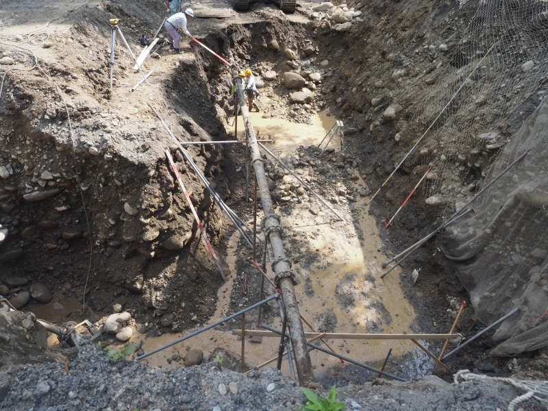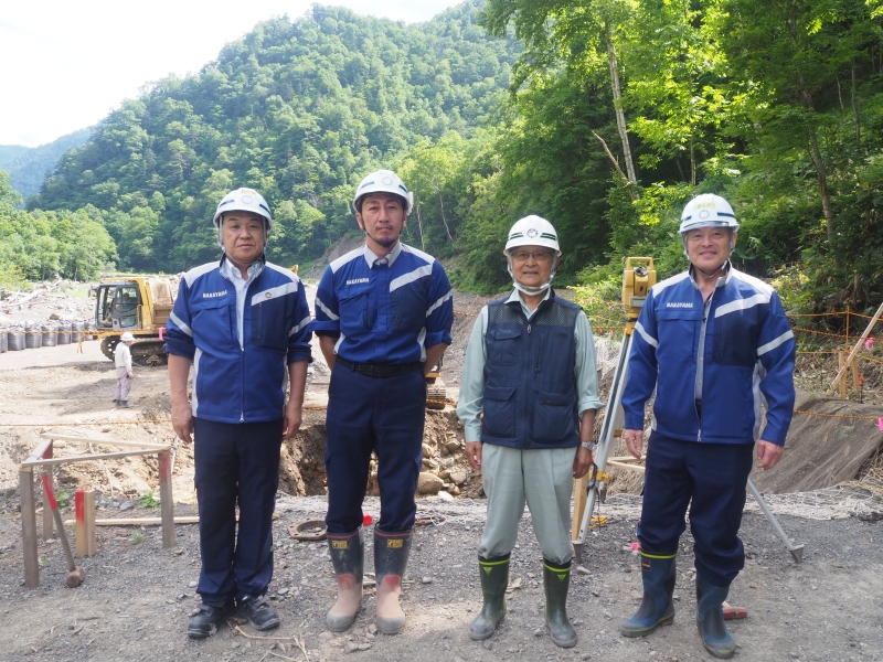 厚真町から離れ、続いて訪問したのは、「日高町パンケヌシ林道」の現場です。こちらは、雨により流されてしまった林道に、擁壁を立て復旧する工事になります。崩れた林道の下に日高町の水源があり、水源を避けるよう擁壁を施工していきます。山の奥にある現場事務所から、さらに細い道を奥に進んだところに現場がありました。現場に到着した時は掘削作業が行われており、間近で見せていただくことができました。林道の先へ行く道が他にないため、復旧した林道を心待ちにしている企業様もいるようです。また、中山社長が来るということで㈱笹田組の笹田社長様が現場に足を運んで下さり、ご歓談されていました。