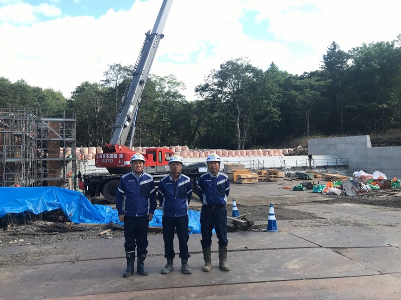 ここは上川町市街から国道を紋別方面に10kmほど向かい、そこから山の中に入った所で施工している水力発電所施設の現場です。現場事務所で担当の本田君、渡辺君と落ち合い現場へ案内してもらいました。