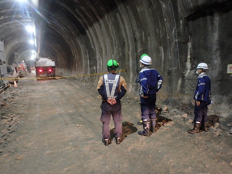 9月5日午後、中山社長の3日間 5現場~移動距離1,000㎞を超える視察の初日、待ち合わせの新得市街で鴻池組の高萩北海道支店長と水沼企業体所長にお出迎えを頂き、施工現場へ移動しました。途中ペンケオタソイ川の橋梁下部工施工箇所を通過し、十勝清水・占冠IC間の4車線化に伴う最初のトンネルとなる「広内トンネル」(L=910m)の東坑口詰所で全施工延長3.5㎞の工事概要・工程・安全対策の説明を受けたあと、トンネル坑内へ移動しました。現在の進行状況や問題点などの質問に、年内貫通を目指し無災害完工に向けた様々な工夫をしていることなど、丁寧な説明を受けました。