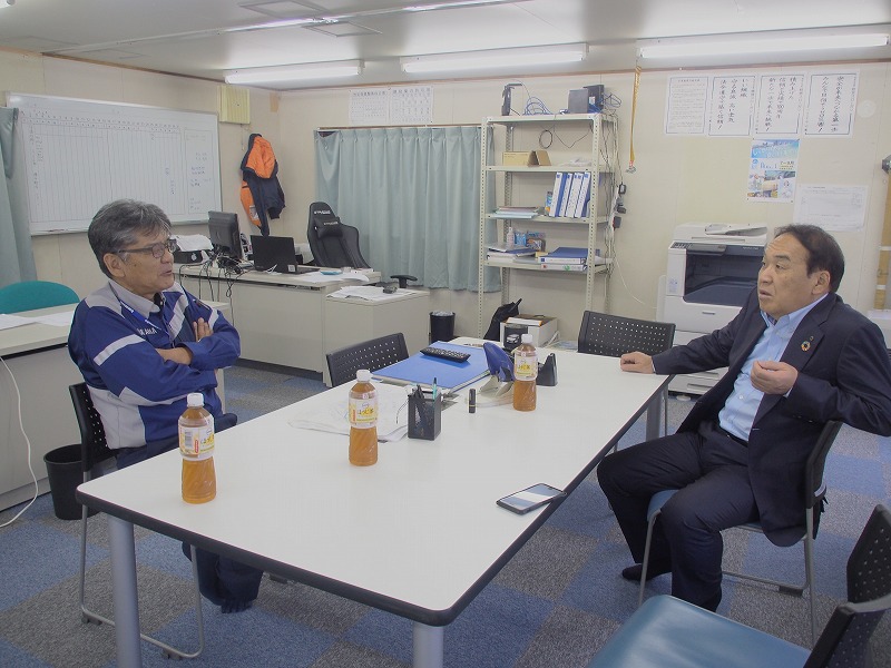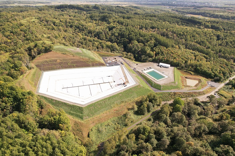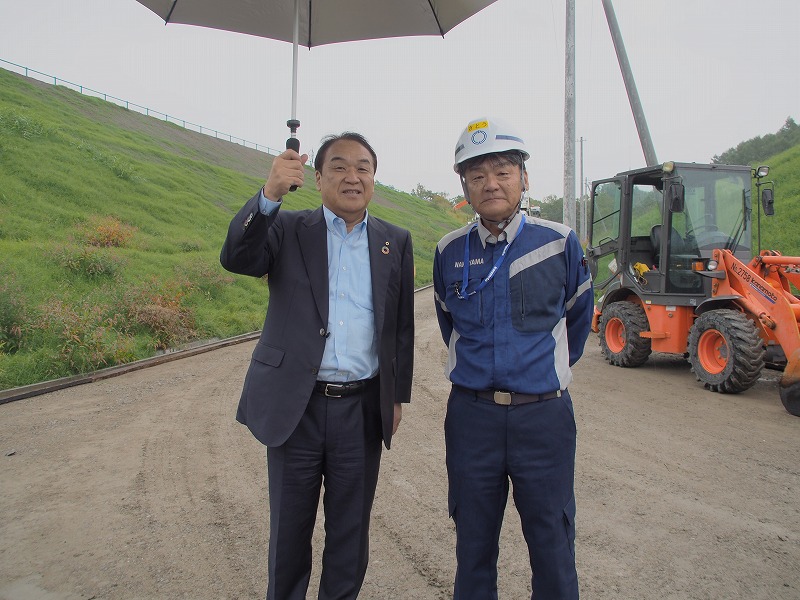 次に向かったのは、「新十津川最終処分場」です。こちらは廃棄物を安全な状態で埋め立てる安定型の処理施設を建設する工事で、昨年に続いて訪問させていただきました。掘削工・盛土工・遮水工・函渠工・沈砂池工など多岐にわたる工種作業を経た大規模な土木工事の完成間近の現場ということで、再度見せていただくのを楽しみにしていましたが、訪問時は現場の入り口までの舗装工事が行われていました。その為、通り抜けることが出来ず残念ながら引き返す形になってしまいましたが、現場事務所から山道をしばらく上る途中も綺麗に整備されており、以前とは景観が大きく変わっていて、もう間もなく竣工を迎える現場の雰囲気が伝わってきました。今年は例年にない猛暑が何日も続いたり、山奥での作業で熊出没情報が出たりと様々な気苦労も多かったことと思いますが、最後まで事故なく無事に工期を終えられるよう願っています。お忙しい中、対応していただきありがとうございました。