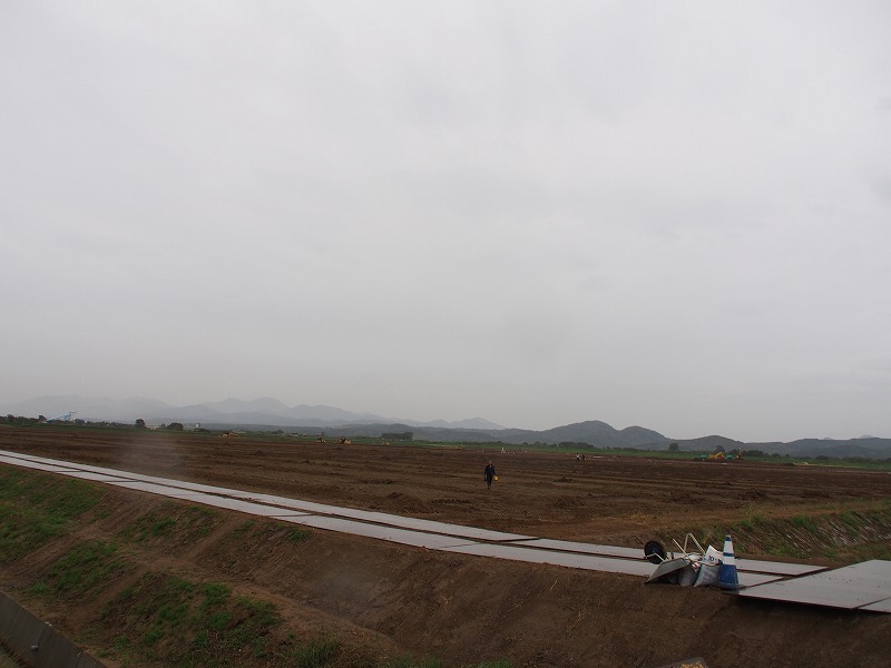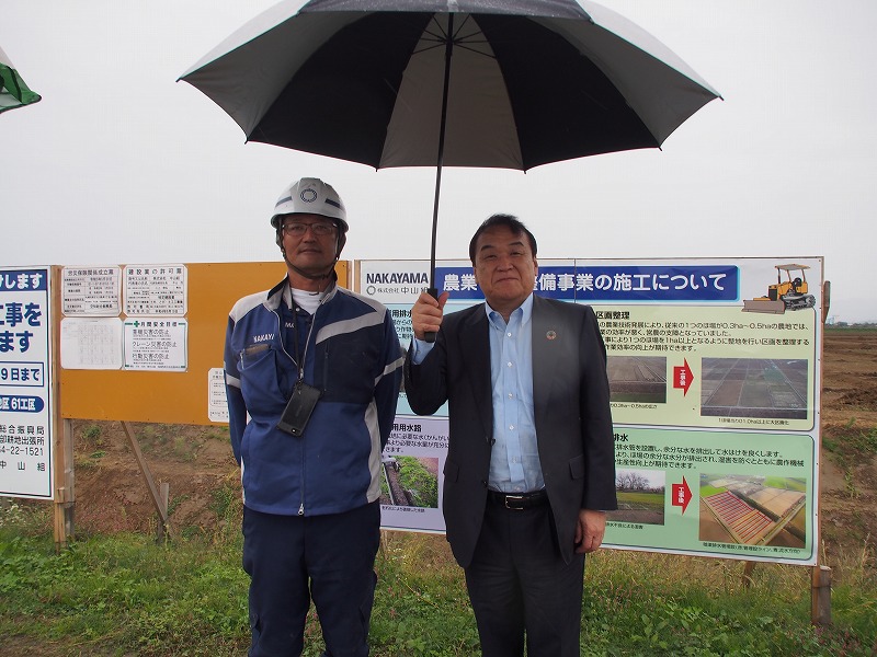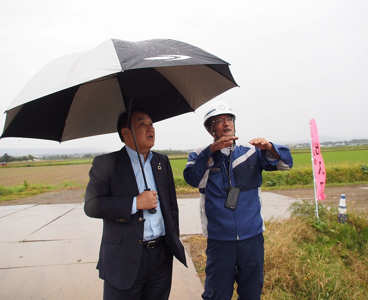 まず初めに向かったのは「滝川西南中央ほ場」の現場です。こちらは農産物の安定的な生産と農業経営の体質強化を目的とした区画整理及び用排水施設整備を行う工事で21.1haを施工します。施工地の9割が現場事務所のある西滝川と東滝川の滝川インターチェンジ付近に分かれており、9㎞近く離れているため移動に時間を要したり、また、二人以上で配置されることが多いほ場の現場を今現在は一人でご担当されていたりと苦労されていることもあるそうですが、一部は引き渡しも完了し、工事は順調に進んでいるそうです。訪問時は悪天候の為ゆっくりと現場を見ることはできませんでしたが、雨のなか対応していただきありがとうございました。厳しい暑さも一段落して過ごしやすい季節になりましたが、体調には十分お気をつけて無事に竣工を迎えられるよう願っています。