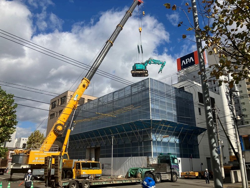 本社を出発して最初に訪れたのは、「薄野変電所旧本館除去」の現場です。すすきの地区へ送電線の電圧を下げて、一般利用できるようにするために設置された薄野変電所を、老朽化に伴い解体する工事となっています。400tもの重機で解体用の重機を2台建物の上に乗せ、上部から徐々に解体を行いながら降りてくるという工法が用いられています。通常の建物外部からの解体方法と異なることもあり、解体の様子を他の会社の方々が見学に来ていたお話も伺いました。現場は、東豊線すすきの駅に繋がるエレベーターが隣接されており、ホテルなども点在しているため人通りが多く、通行人への安全の配慮が常になされていました。街中であることから、騒音などの関係で時間規制もあるようですが、無事に1月の竣工を迎えていただきたいです。ご対応していただきありがとうございました。