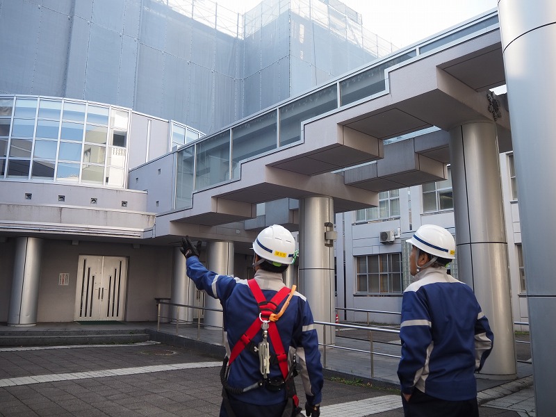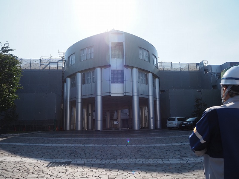 続いて訪問したのは、「札幌南高改修」の現場です。札幌南高校の校舎外部の改修が工事内容となっており、具体的には外壁の補修や屋上防水の改修等が行われています。こちらの校舎はデザイン性がとても高く、建物自体が所々ユニークな形で設計されています。そのため改修作業も複雑なものとなっており、足場の組み方や作業の手順など作業ごとに多くの工夫が必要なようでした。また、教育活動への妨げとならないよう作業時間など最大限に配慮しつつ、計画的に作業も進めるという厳しい状況下での工事となっています。体育館などは既に昨年第1期工事にて作業が終了しており、改修工事が完了した建物も見せていただくことができました。外装が丁寧に綺麗に改修され、安全面においても安心して使用できるようになる校舎を、学校関係者の方々は心待ちにしていると思います。取材当日は、お忙しい中ご丁寧に説明していただきました。ありがとうございました。