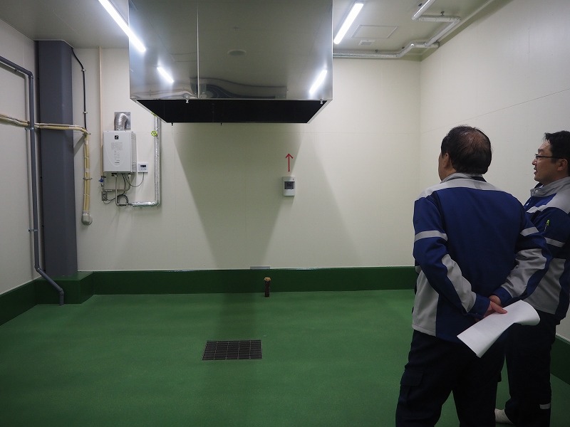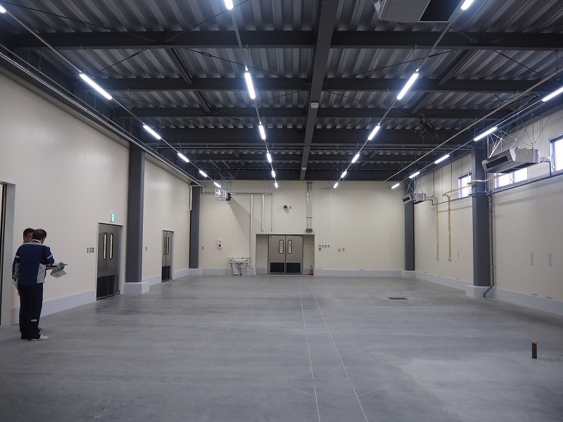 次に訪問したのは、「コープフーズ石狩増築」の現場です。コープフーズ石狩食品工場では、和・洋総菜やカットされた野菜、フルーツ、レンジ商品やパン類など約400アイテムを製造し、全道に配送しています。こちらの現場ではその広い敷地内に食材を入れるコンテナの洗浄室を増築する工事が行われていました。訪問時、建物は既に完成しており、内部を見学させていただくことができました。建物は完成しているのですが、これから既存の建物に入っている、コンテナ洗浄機という大きな機械を移設し、配管、配線の接続作業が残っています。工場の作業を一時休止しての移設になるため、3日間という限定された時間の中でスムーズな移設が求められます。まだ気の抜けない作業が残っていますが、無事に竣工を迎えていただきたいです。ご丁寧に説明し見学させていただいただきありがとうございました。