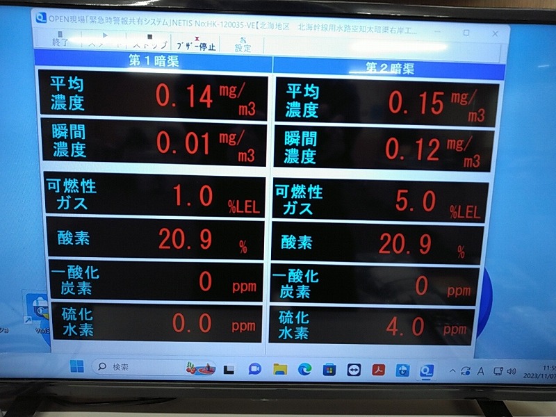 1工区は200mと500mの計700mにわたり暗渠工内での作業となるそうで、QRコードを読み取ると可燃性ガスや一酸化酸素濃度が確認できる計測機器を設置するなどして、安心して作業ができる環境が整えられていました。計測した数値は現場事務所内のモニターでもひと目でわかるようになっていて、長い距離の暗渠内での作業ということで安全面にはより注意して慎重に取り組まれていました。