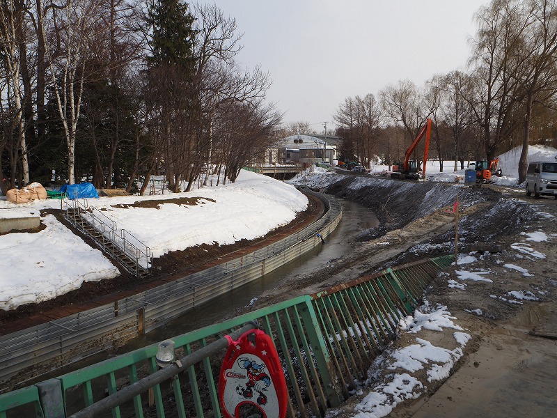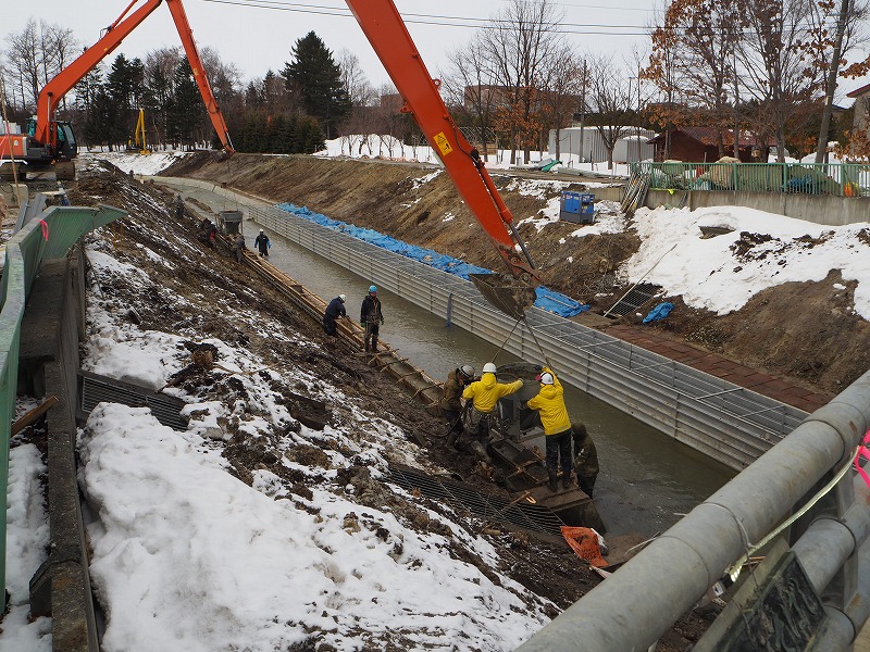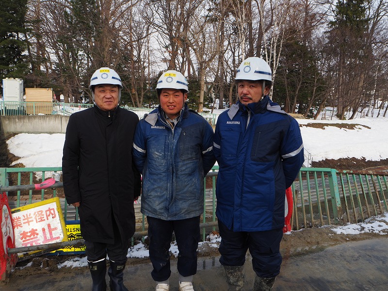 こちらは、「R5利根別川河川改修」の現場になります。こちらの現場は、洪水対策として既設の護岸ブロックを解体し新たにブロックを設置し川の拡幅を行っています。施工場所が岩見沢農業高校の敷地内ということもあり、登下校時に工事区間を生徒が通るため車両の出入り制限など安全面に細心の注意を払っているとのことです。また厳しい工程での施工となりとても苦労しているとのことでした。訪問前日の気温の上昇により雪が溶けてしまい、川の水位が上がってしまうなど天候面においても大変な現場でした。今年の岩見沢市は降雪量がかなり少ないとのことでしたが天候面はもちろんのこと、事故などがないよう工事を終えてほしいと思います。お忙しい中、対応していただきありがとうございました。