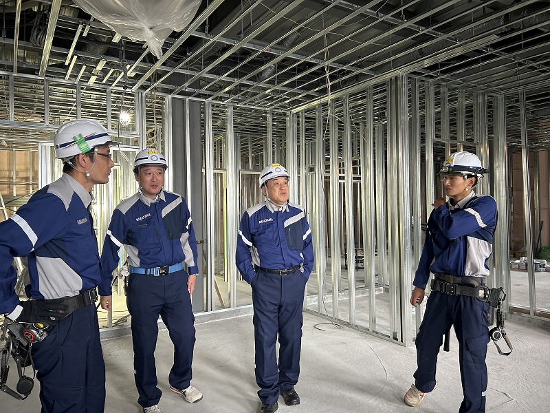 現在は壁や天井の下地が終了し、内装仕上工事に入る段階でした。外観は最後の仕上げに入っており、来週にも足場を解体する作業に取り掛かることができるとのことです。今後も安全に留意し竣工を迎えてほしいと思います。お忙しい中、丁寧に説明をしていただいた現場の方々本当にありがとうございました。