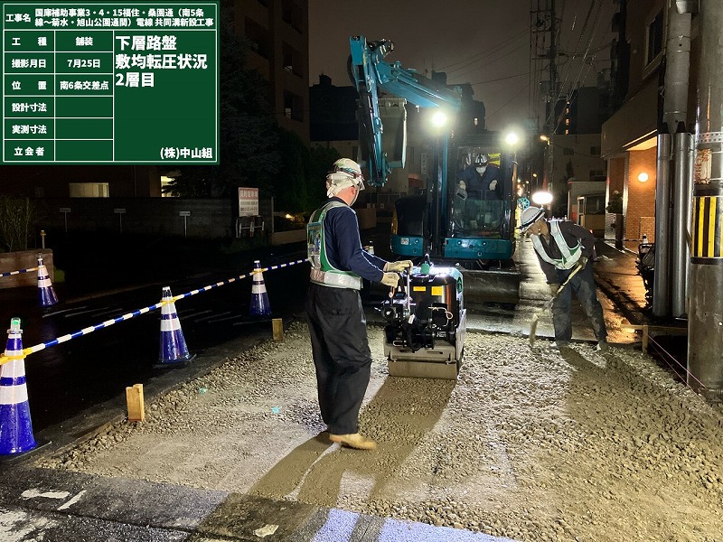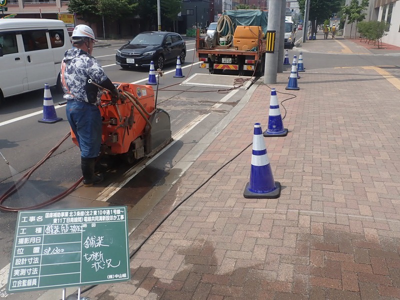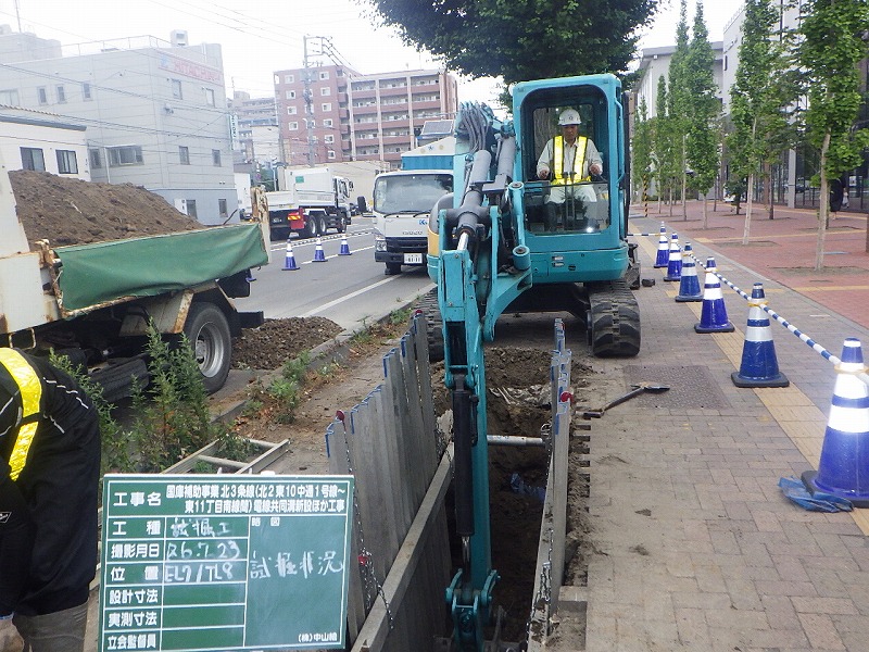 電線共同溝工の区間は約178m、作業としては試掘作業が終わったところで、資材が届き次第引き続き電線共同溝工を進めていくとのことです。また同時に道路改良工も始めるそうで、そちらでは歩道のバリアフリー化を進めていきます。その他にも苗穂駅内の電気設備工事などの施工が控えており、作業量の多い現場となっています。