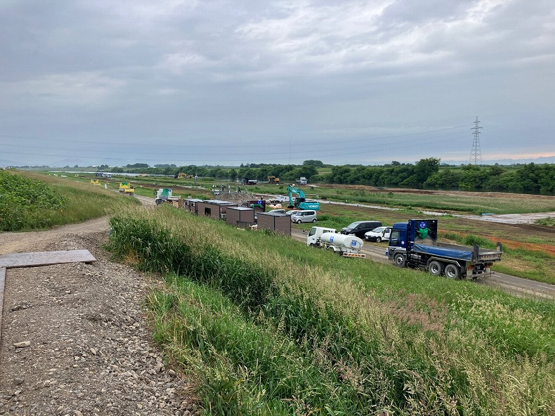 最初に訪問したのは「豊平川雁来築堤掘削外」の現場です。こちらの現場は施工が順調に進み、訪問時には工程の多くが完了している状態でした。今後は河川敷の伐開作業などを行っていくため、その準備を進めているとのことでした。
