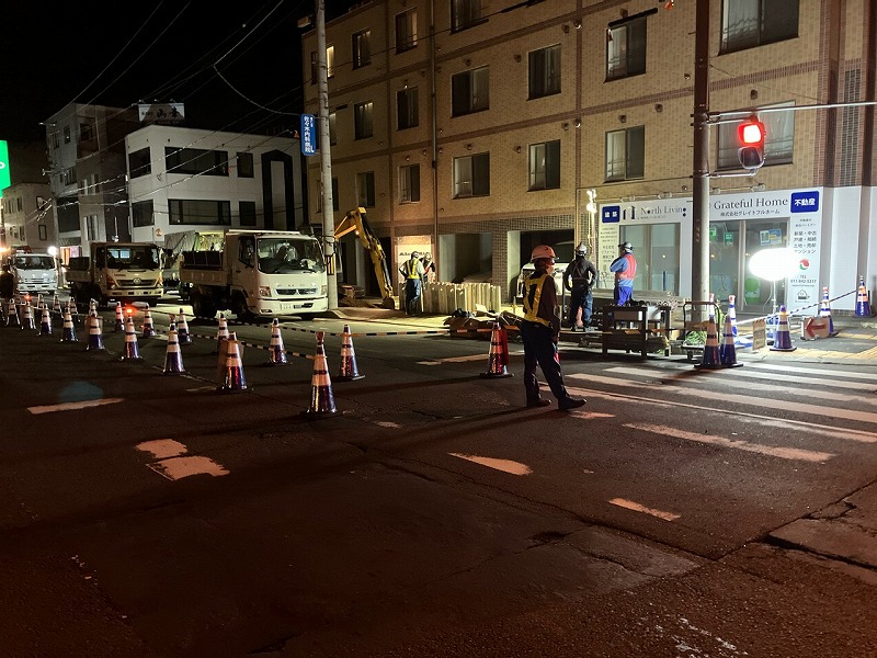 施工場所は地下鉄の美園駅(札幌市営地下鉄東豊線)に近く交通量が多い場所です。3車線の道路のうち2車線を規制しなければならないため、交通量の少ない夜21時以降に作業を進めています。現在は、電気やガスの線、信号のケーブルなどを通すための管路工を行っています。また、電柱だけでなく街灯も撤去されて中央分離帯に設置されるため、歩道が広く通りやすくなるとのことでした。
