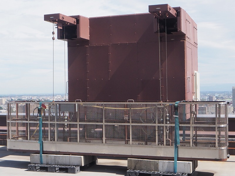 使用する仮設のゴンドラは300tクレーンで荷揚げをして屋上で組み立てたものと庁舎に既存されている1基を使用。