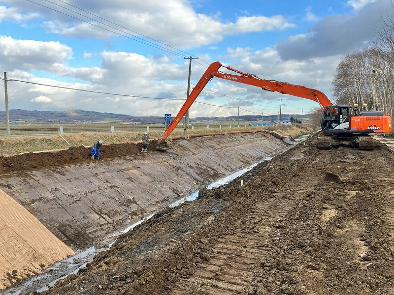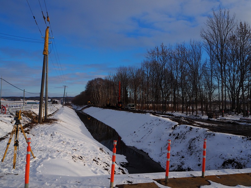 南九号川の河道拡幅に伴う橋梁改修工事が行われています。この工事は、南九号川の洪水や農地浸水などの災害を防止するための重要な取り組みです。近隣の橋台は、トレーラーなどの特殊車両の重量に対応していないため、設計変更が必要となり、迂回路工や仮橋工の追加もありました。そのため工種が多く、工程調整が非常に難しい状況です。また、施工箇所付近には長沼町や由仁町への送水している水道本管があり、振動が少しでも発生すると長沼町および由仁町全域の水道が濁る恐れがあるため、十分な注意を払って作業が進められているようです。