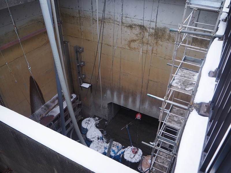 続いては、千歳川南6号樋門撤去の現場です。本工事は、千歳川南6号排水機場の樋門撤去に伴う築堤の開削および盛土工事です。昨年新たに設置された樋門と水槽の接続部を開口した後、築堤の開削、旧樋門の撤去、築堤盛土を行います。水槽の高さは10メートルにも及び、作業を進めるにはクレーンが必須です。また、現場近くには農業用水の取水口があり、強い流水が流れ込むため、水流管理が重要です。そのため、7台ものポンプを使用して水替えを行い、新しい樋門の開口作業が進められました。取材当日もポンプが稼働しており、さらにバックホウが5~6台同時に作業を行っていたため、非常に迫力のある現場でした。