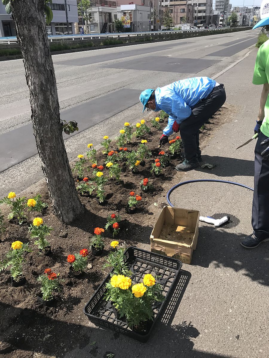 2020-06-08令和2年6月5日、「N19ともえ会 創成川通り美化推進活動」を実施しました。この活動は北海道開発局のボランティア・サポート・プログラムとして平成19年から継続しており、今年で14年目になります。今年もN19ともえ会の各社社員で、創成川通りの北18条~北20条間の23か所の植樹枡の清掃と花植えを行い、マリーゴールドなど約800株を植えました。