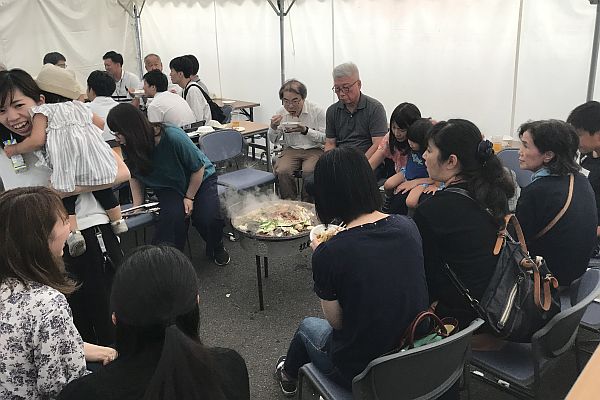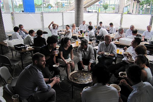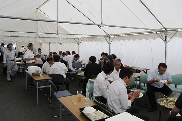 本社ビル駐車場にテントを張り、約50kgのジンギスカンのほか、おにぎり、ホタテ、イカ・魚・野菜の炭焼き等とともにお酒を楽しみました。暑い日が続いていたこともあり、ビール125L、日本酒、焼酎、ワインなど昨年以上にお酒が進みました。中山組社員のほか、関連会社社員の皆様、ともえビルテナントの皆様、取引先の皆様、近隣住民の皆様などに来ていただき、今年は総勢145名の参加となりました。2時間ほどの短い時間でしたが、大いに盛り上がることができました。