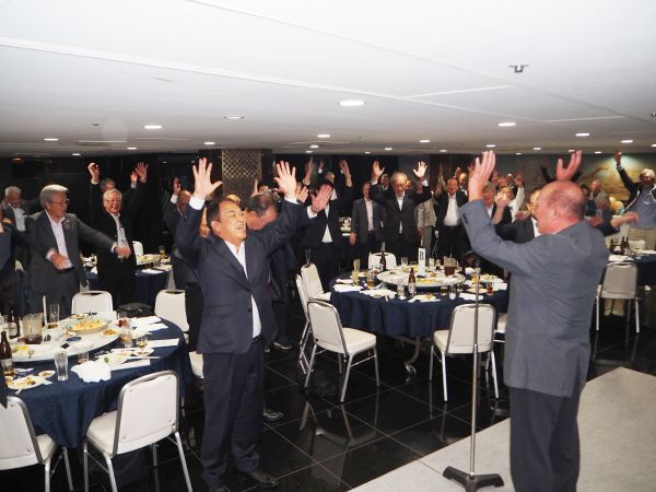 新入OB会員のご紹介に続き、喜寿・米寿の長寿祝い、さらには婚礼の記念のお祝いで熱い拍手が注がれました。