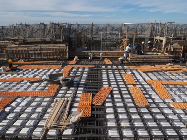 最後に訪問したのは「ボールパークMS」です。こちらではマンションの屋上(地上46メートルほど)での作業と各階の様子を見せていただきました。また、屋上へ登る際には各施設が施工されているボールパーク全体の様子を一望することができ、スタジアムの屋根がマンションよりも高いことが分かりました。訪問時にはW棟最上階躯体コンクリート打設直前となっており、その後塔屋階の打設をしていくとのことでした。また、内装工事が下の階から始まっており、進捗率は70.0%ほどだそうです。