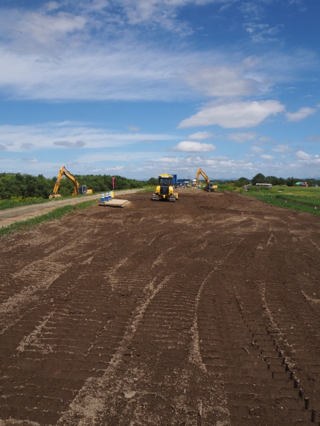 一番はじめに訪問した現場は「旧夕張川堺橋下流築堤」です。この現場では、盛土を施工する際、盛土材を約25km運搬する必要がありました。また、運搬の際には長沼町の街中を通るため、特に気を遣って作業されたそうです。他工事が隣接していることもあり、調整に時間がかかったとのことでした。盛土の厚さは2m程度のことでしたが、施工延長は1kmありました。ICT機械を使用することで、作業の効率化などにも工夫を重ねているとのことです。訪問時に運搬作業は終盤にさしかかっており、工事が順調に進んでいることがうかがえました。