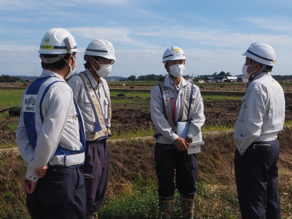 こちらの現場を訪問した際には、暗渠工、畦畔工や用水路のトラフ設置などが行われていました。施工を進めていくなかで、現場の地質に砂層があったために設計を変えたり、整地業者の不足によりブルドーザーが現場になかなか来てもらえずに苦労したりと話を伺いました。今後は整地工、暗渠工をメインに作業していくそうでした。