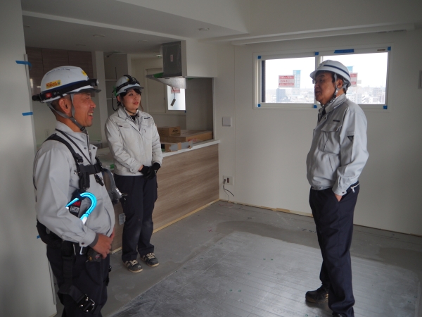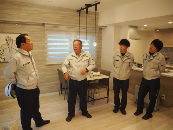 年内には工事をほぼ終え、年明けに検査、手直し、2月末からは家具の搬入に入り、来年3月より新社員寮として使い始めます。新社員寮完成まで残りわずかとなってきており社内の関心も高まってきています。竣工に向け、残り僅かですが、無事故で工事を進めていってほしいと思います。お忙しい中、丁寧に説明をして頂いた現場の方々本当にありがとうございました。