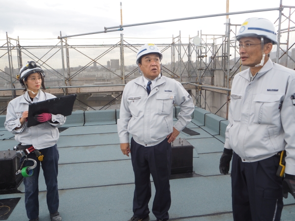 太陽光発電設備や蓄電池、ガス発電機等を備え、緊急時には本社機能を補うほか、防災拠点として機能する設備も整えてあります。また女性向けフロアの設備等プライバシーや防犯に配慮した造りになっています。取材時には太陽光パネルが設置される屋上、各階の進捗状況を説明してもらいながら見学しました。