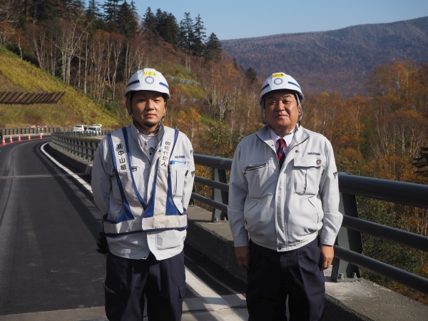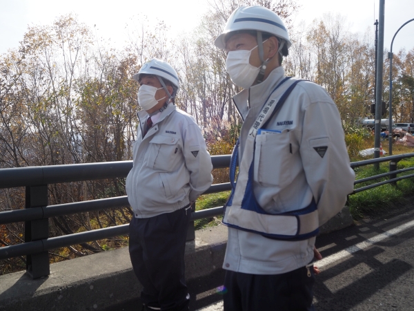 最初に訪問したのは、札幌市望岳橋補修外の現場です。こちらの現場は中山峠の望岳橋、凌雲橋の2つの工区で橋梁の補修を行っている工事です。最後となる橋桁の塗装工事が数日前に終わり、足場の解体を訪問の前日に行ったとのことで、橋の上から完成した工事場所を見せていただきました。この日の夕方には交通規制も解除になるとのことで、現場担当の泉さんは、無事故で工事を終えることができてよかったとお話していました。工事中は大型車の通行も多い道路での昼夜間の交通規制で危険や苦労もあったとのことで、社長も労いの言葉をかけていました。丁寧なご対応ありがとうございました。