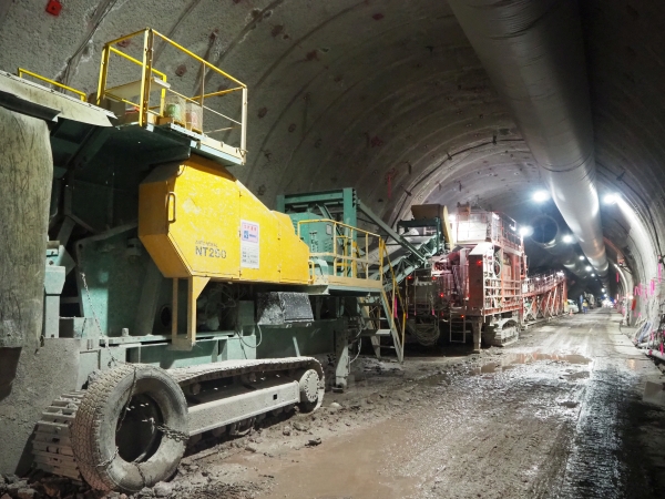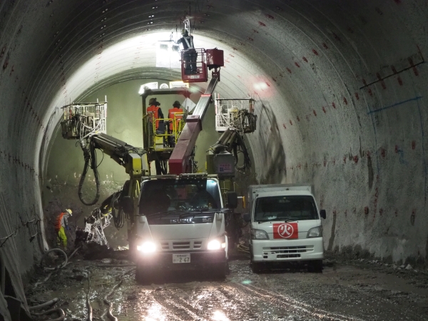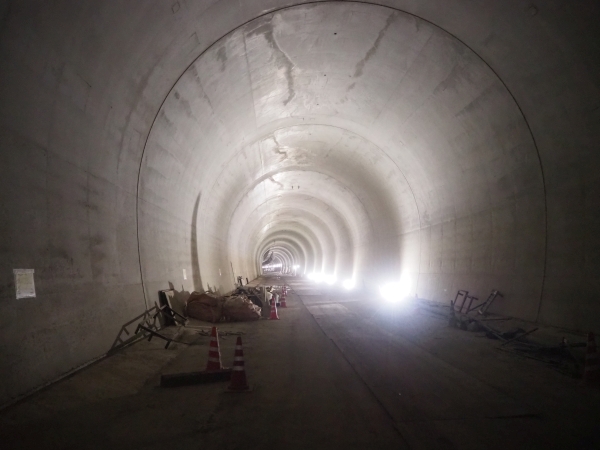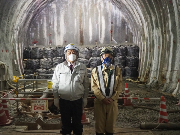 トンネルの掘削延長2,457mのうち残り43mというところまで工事が進んでおり、11月には掘削が終了し、12月には貫通式が行われるとのことでした。このトンネルは発破掘削とのことで、訪問時には坑内の掘削面へ火薬装填用の穴をあける作業が行われていました。貫通までもう少しということで、竣工まで無事故無災害で作業されることを願っています。お忙しい中ご対応いただきありがとうございました。
