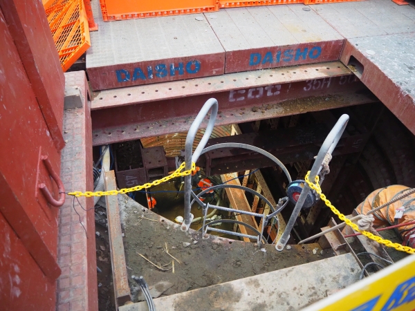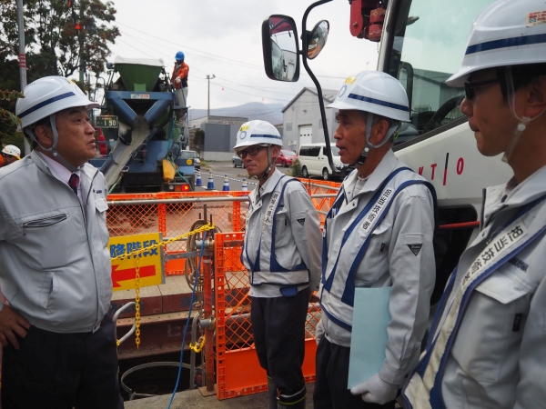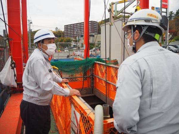 最後に訪問したのは、新川5号送水管新設の現場です。施工場所は前に訪問した宮の沢5号送水管新設工事の現場の近くにあり、こちらも送水管の布設等を行っている現場です。訪問時には3箇所で開削工、発進立坑の掘削、到達立坑の薬液注入の作業がそれぞれ行われていました。施工場所の地下水位が高い事と土質が砂質土の為、油断すると地面の陥没の可能性があり日々の地山の状態を確認しながらの施工に大変苦労されているとのことでした。来年1月の竣功に向け安全作業で工事を進められるよう願っています。お忙しい中ご対応ありがとうございました。