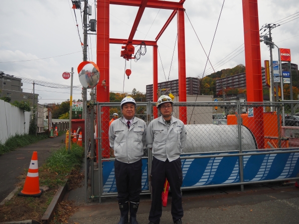 次に訪問したのは、宮の沢5号送水管新設の現場です。こちらの現場は、当別から西部配水池へ送水するための管路を新設する工事の一部になります。訪問時現場には、地面より約12m下で水道管を入れる為のさや管を推進機で設置する作業が行われていました。施工場所が手稲区と西区にまたがっていることや高速道路の下を通ることなどから、関係各所との協議に苦労されているとのことでした。無事故・無災害で竣工を迎えられることを願っています。お忙しい中丁寧にご対応いただきありがとうございました。