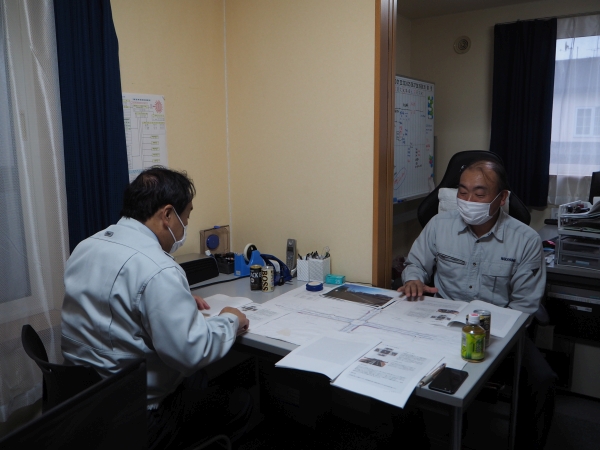 最初に訪れたのは、「老健コスモス改修」の現場です。訪問時は、事務所内でお話を聞かせていただきました。施設の概要として1階は多数の事務所とデイサービス施設、2階は入所者の方々の部屋となっており全部で103床あります。建物自体が大きく、施設を運営しながらの施工のため部分ごとでしか進められず、また施工箇所も多く、部分完了時検査が頻繁に行われ、とても時間がかかるようです。様々な面で気を配る部分が多く、感染症予防対策にも苦労されているようですが、体調含めて無事に竣工を迎えていただきたいと思います。